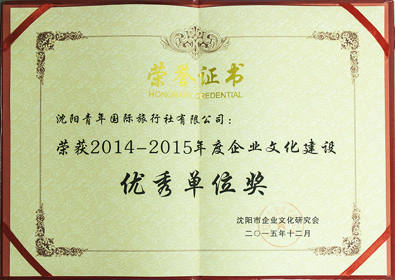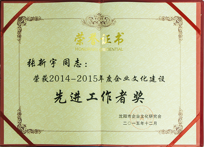 2015年12月15日,沈陽市企業(yè)文化研究會(huì)授予我社2014-2015年度企業(yè)文化建設(shè)優(yōu)秀單位獎(jiǎng),同時(shí)為我社張新宇總經(jīng)理頒發(fā)2014-2015年度企業(yè)文化建設(shè)先進(jìn)工作者獎(jiǎng)!