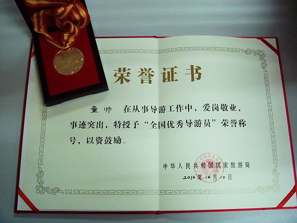 沈陽青旅員工童帥,在從事導(dǎo)游工作中,愛崗敬業(yè),實(shí)績突出,被中華人民共和國國家旅游局授予“全國優(yōu)秀導(dǎo)游員”榮譽(yù)稱號(hào)。