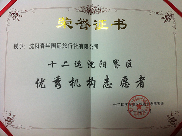 熱烈慶祝沈陽青年國際旅行社榮獲“第十二屆全運會沈陽賽區(qū)優(yōu)秀機構(gòu)志愿者”稱號。在全運會期間,沈陽青旅全力配合大會的召開,出色完成了機構(gòu)志愿者工作,為全運會順利舉行貢獻我們的一份力量。