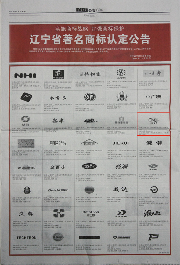 12月31日 根據(jù)《遼寧省著名商標認定和保護辦法》及有關(guān)規(guī)定,遼寧省工商行政管 理局認定 沈陽青年國際旅行社有限公司“沈青旅”商標為遼寧省著名商標!