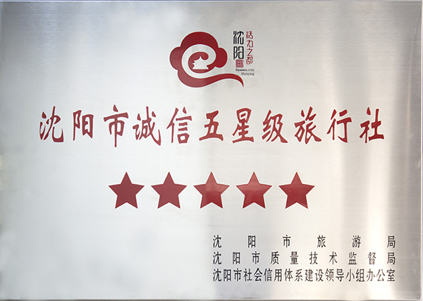 熱烈慶祝沈陽(yáng)青年國(guó)際旅行社被“沈陽(yáng)市旅游局”和“沈陽(yáng)市質(zhì)量技術(shù)監(jiān)督局”評(píng)為:《沈陽(yáng)市誠(chéng)信五星級(jí)旅行社》!